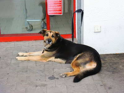 Es war wieder Mittagszeit, so gegen 13 Uhr (so genau weiß ich nicht mehr wann), wir suchten uns wieder in einer etwas größeren Stadt einen Supermarkt auf. Diesmal war's ein Penny. So ging Dimi wieder einkaufen und ich musste auf die Fahrräder aufpassen. Zum Glück nicht alleine.