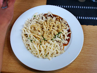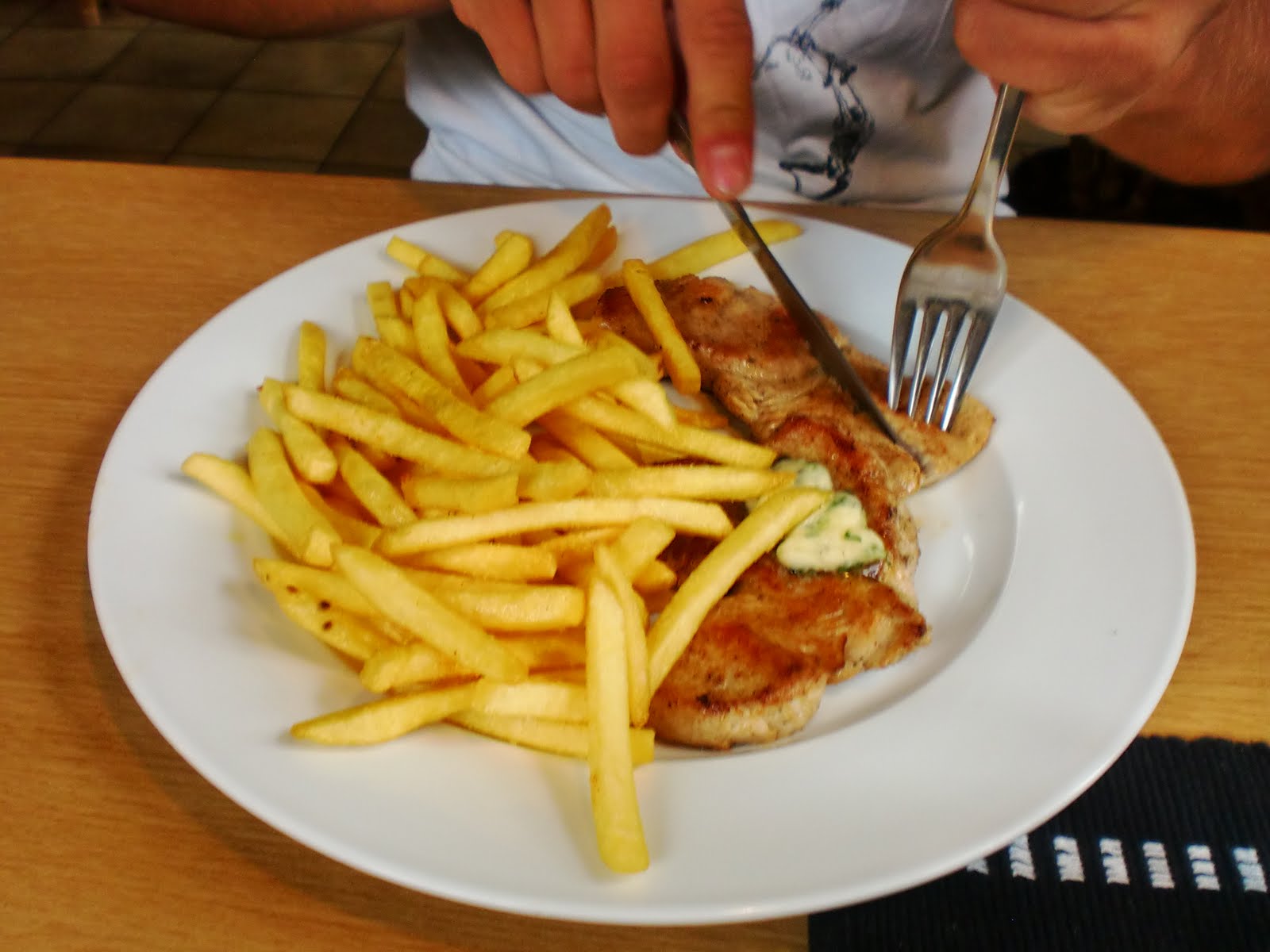 Mittags haben wir uns die erste Gaststätte ausgesucht, der wir begegnet sind. Es war keine so gute Idee. Zwar waren wir vorm Regen sicher und konnten uns trocknen, aber das Essen war total schlecht und teuer. Dimi's Schnitzel mit Pommes kostet fast 7 Euro. Meins kostete zwar nur 3 Euro, wurde aber innerhalb von einer Minute verschlungen.