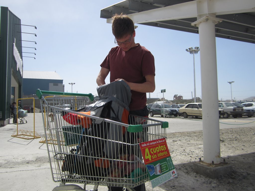 Die Obst- und Gemüseabteilung besteht aus vier Reihen, die jeweils zwei Meter lang sind, und einem Kühlregal. Ulug nimmt sich von fast jeder Frucht, die dort angeboten wird. „Mh, wieder einmal keine Avocados..., aber gut, dass wir zu Hause noch ein paar haben.“. Ulug ist wieder einmal begeistert von der Größe einer argentinischen Avocado. Sie ist so klein, wie der Kern einer deutschen. Langsam füllt sich sein Einkaufswagen, Die meiste Zeit verbringt er in der Obstabteilung. „ Dann noch schnell den Käse und das Wasser.“, geht Ulug die Einkaufsliste im Kopf durch, „ Bloß nichts vergessen.“. In seiner Brusttasche stecken 200 Pesos, Papiergeld, das in seinen Händen fast zerfällt. An der Kasse gucken ihn die Leute seltsam an, wahrscheinlich sind sie fasziniert, dass Ulug hauptsächlich Obst und Gemüse kauft. Die Kasiererin lässt sich viel Zeit, sie hat Probleme mit dem Wechselgeld. Ulug schaut der Sache zu. Er versteht noch nicht alles, weil die Leute viel zu schnell für ihn reden. Ein paar Worte hört er raus. „Anscheindend will sie einen Hunderter wechseln...“. Es hat funktioniert, der Mann vor Ulug hat bezahlt. „ Hola.“, schaut die Frau Ulug an, „(brauchen sie ein Karton zum Einpacken für Ihre Sachen?)“, „No, gracas.“, antwortet Ulug. Er hat schließlich einen Rucksack dabei. „89 Pesos.“. Ulug zahlt und nimmt das Wechselgeld. Auf gar keinen Fall darf er den Kassenzettel vergessen, damit er nächste Woche wieder Essengeld bekommt. Einkauf erledigt. Jetzt müssen die zwei nur noch zurück.
