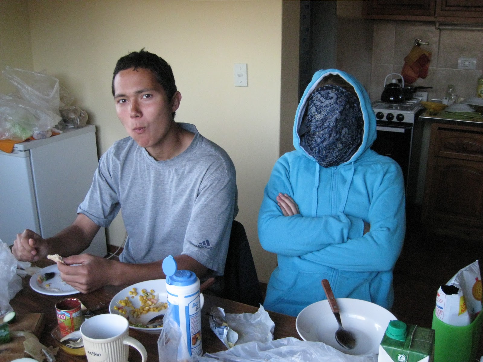 Nach vielen Minuten sind beide endlich angekommen. Beto, der Hausmeister, hat die Türen so prepariert, dass sie automatisch schließen. „ Ein wenig Luxus.“, denkt Ulug sich und stellt sein Fahrrad an die Wand. Mit der schweren Tasche geht er die Treppen hoch, es müssten zehn Stufen sein. In der Küche stellt er alles auf den Boden und fängt an auszupacken. David kommt jetzt auch hoch. Alles wird schön sortiert, in den extra für die Freiwilligen angefertigten Regalen ist genug Platz. Ulug setzt sich wieder an den Tisch und freut sich über das Mittagessen. Brot wird immer täglich frisch gebacken. Der Bäcker bringt es immer vorbei. Es klöpft an der Tür, ihr Brot ist da. David nimmt es entgegen. Sie reden noch ein wenig, aber Ulug versteht nichts. Er steht auf und holt sich eine Tomate und eine Gurke. Es wird gegessen.